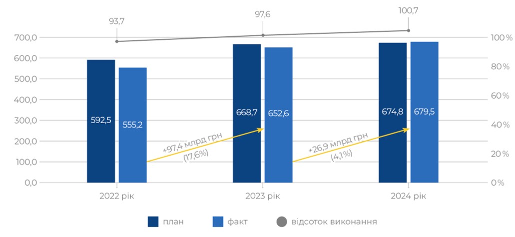 Видатки місцевих бюджетів у 2022–2024 роках збільшилися з 484,4 млрд грн до 671,8 млрд грн, але були меншими від запланованих обсягів.
